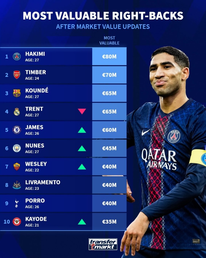 最新足坛右后卫身价排行榜:阿什拉夫8000万欧元最高,廷伯排第二