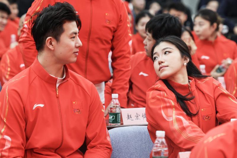 1月27日,花样滑冰运动员王诗玥、柳鑫宇(左)在米兰冬奥会中国体育代表团成立动员大会后。新华社发